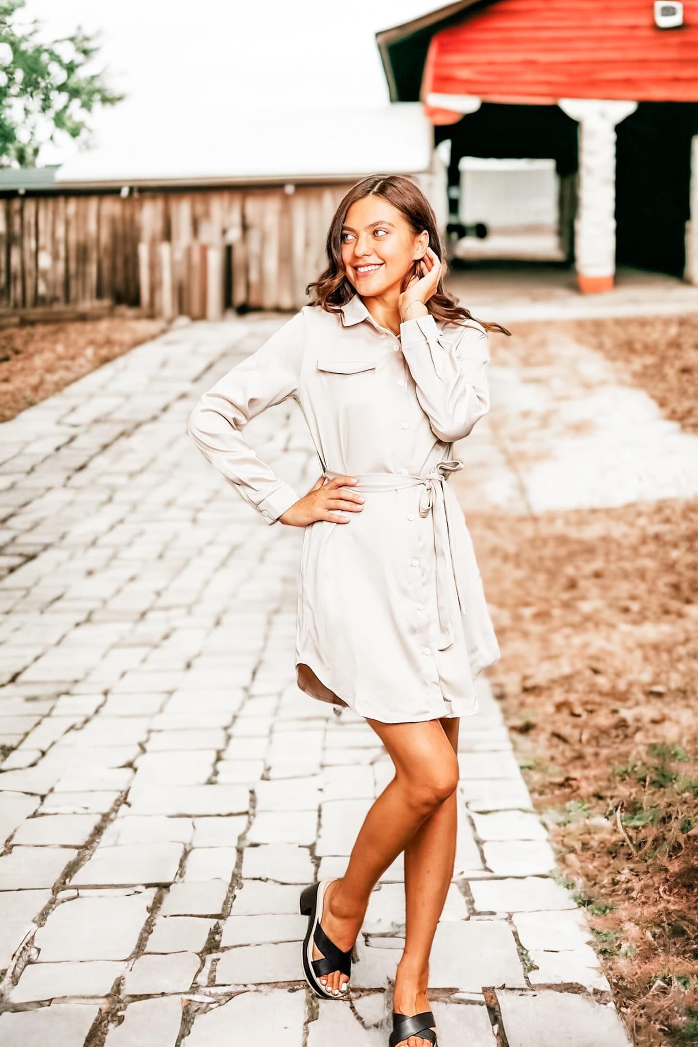 Collared Neck Tie Waist Long Sleeve Buttoned Dress
