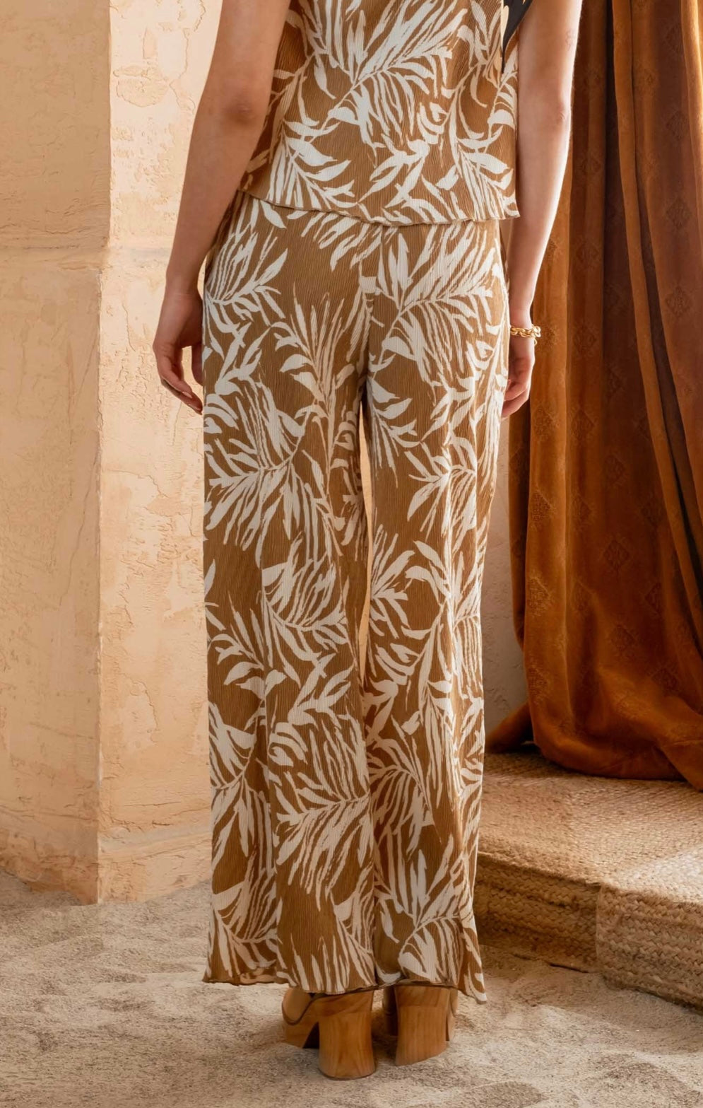 Leaf Print Plisse Dress Pants